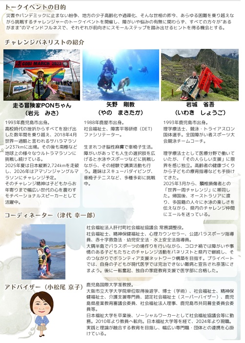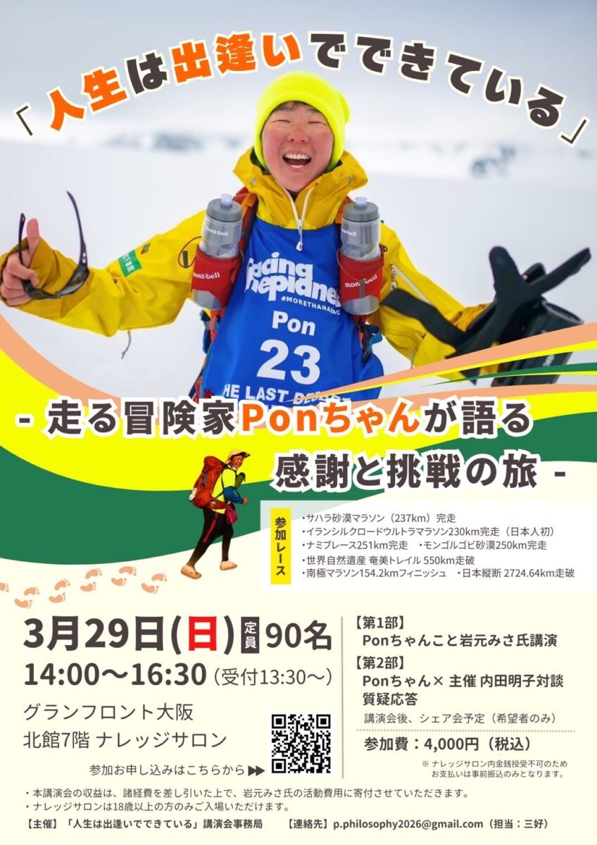 ぽんちゃんは、砂漠マラソンに挑む中でのストーリーを話すことを通じて、聴講する皆さんが本当にやりたいことに対し「勇気を持って一歩踏み出す」きっかけになればと考えています。