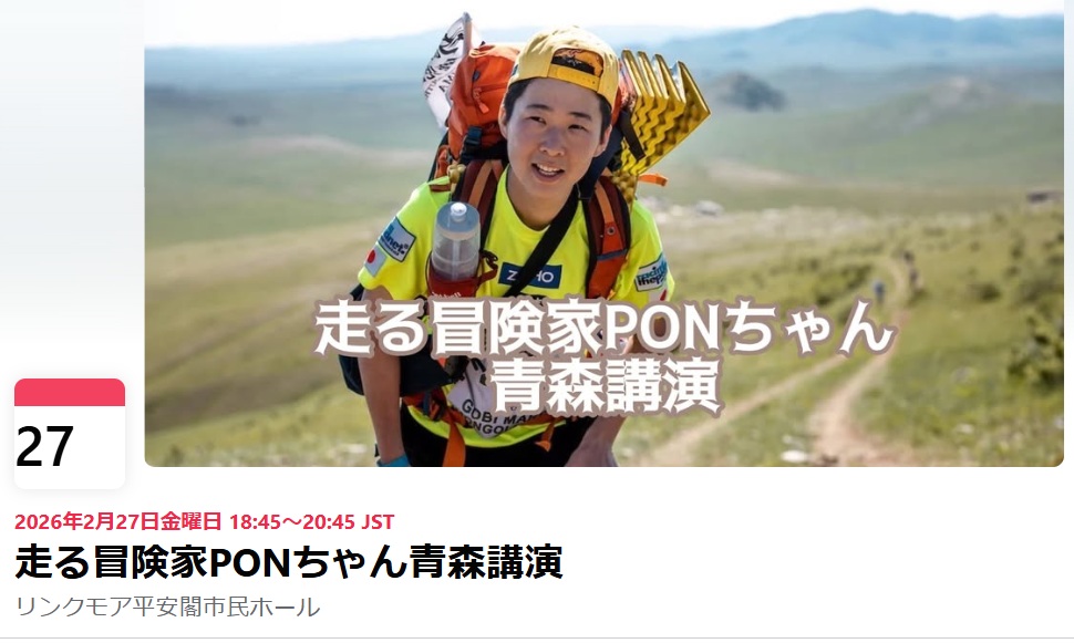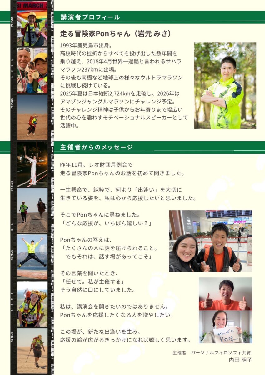 こんにちは、走る冒険家Ponです!いつも応援ありがとうございます。鹿児島を中心に各地で講演活動や、イベント企画・出演しています。現在、全国展開の駆け出し段階です。講演依頼お待ちしています!今後のスケジュールはTimeTreeの公開カレンダーまたは当サイトのお知らせをご確認ください。一緒に楽しい時を過ごしましょう!