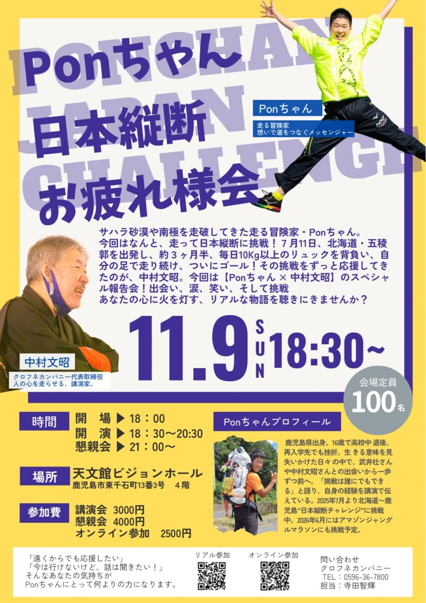 「何のために生きるのか?」という問いを軸に、全国で年間300本を超える講演を行う人気講師である中村文昭さんが代表取締役をされている「クロフネカンパニー」さんが「Ponちゃん日本縦断お疲れ様会(講演会&懇親会)」を企画してくださいました。ありがとうございます‼