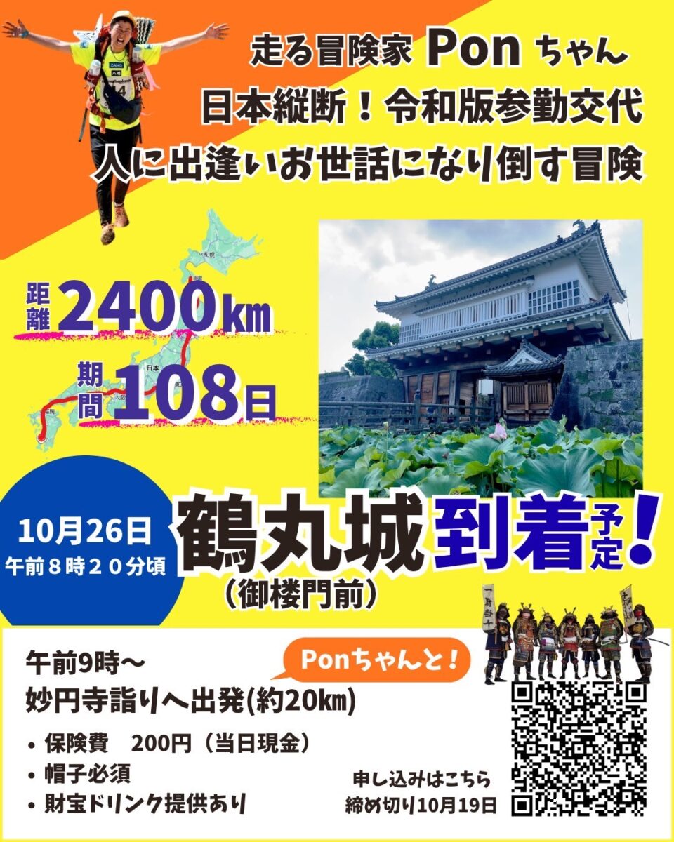 いよいよ10月26日(日)、鶴丸城(鹿児島城)で「令和版参勤交代」のゴールを迎えます。その日は、鹿児島の伝統行事である「妙円寺詣り」が行われる日です。Ponは8時20分頃到着し、9時頃そのまま妙円寺詣りに出発します。