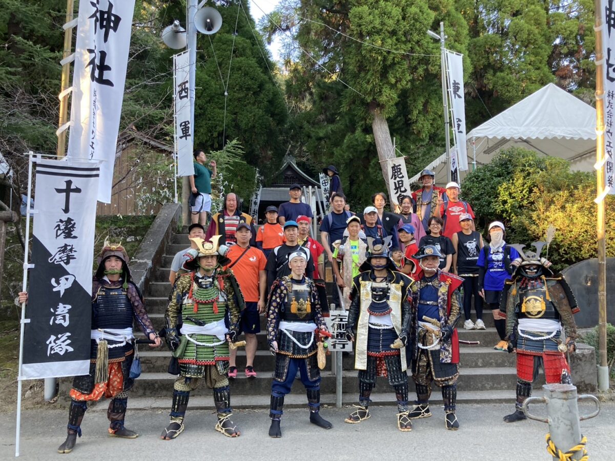 10月26日(日)にゴールを迎えた「令和版参勤交代」でしたが、その日は、鹿児島の三大行事の一つである「妙円寺詣り」が実施される日でもありました。8時20分頃鶴丸城御楼門前で出迎えてくださった方々へのあいさつや記念撮影を終わらせた後、9時から薩摩甲冑隊の皆様と事前申し込みされた皆様と一緒に日置市伊集院町の徳重神社を目指して約20km歩きました。