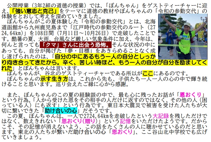 11月11日のブログで紹介したように、鹿児島市立谷山北中学校でキャリア教育の研究公開があり、3年生の公開授業(特別の教科道徳)でPonがゲストティーチャーとして授業に参加しました。