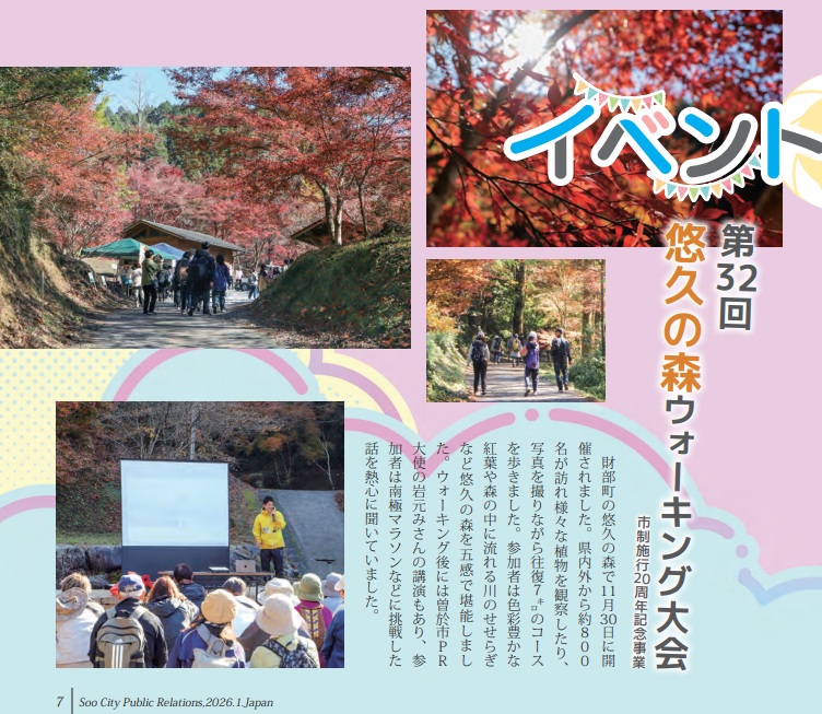 曽於市報であるSooCity2026年1月号に11月30日行われた悠久の森ウォーキング大会の様子が掲載され、Ponの講演の様子も紹介していただきました。