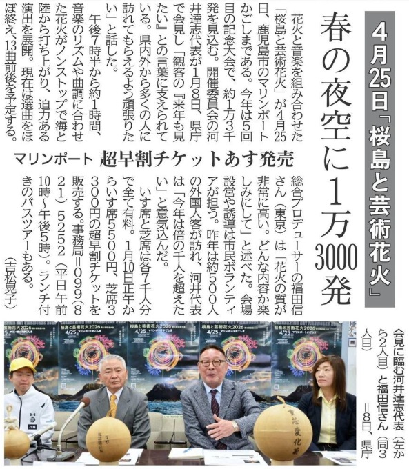 昨日のブログでお伝えした「桜島と芸術花火」記者会見が本日の南日本新聞14面に掲載されました。