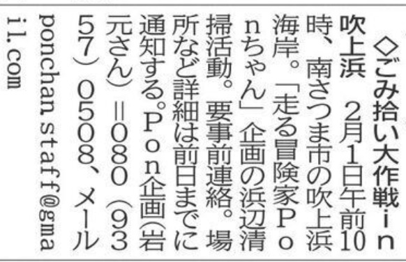 23日(金),南日本新聞19面「みなみのカレンダー」に,2月1日(日)開催予定の第21回ゴミ拾い大作戦in吹上浜の案内を掲載していただきました。