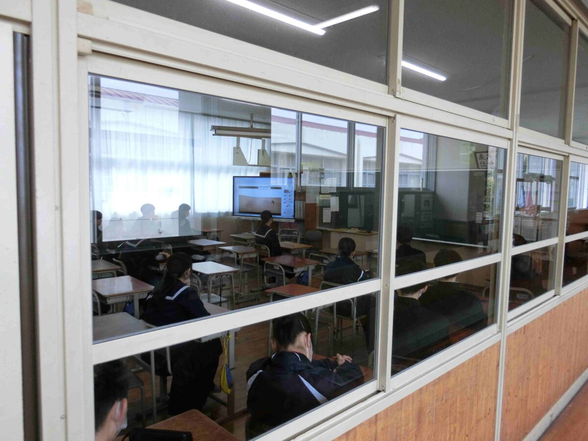 インフルエンザ蔓延予防のため、多目的室に生徒会代表のみ集合し、他の生徒にはリモートで各教室につなぐという形となりました。
