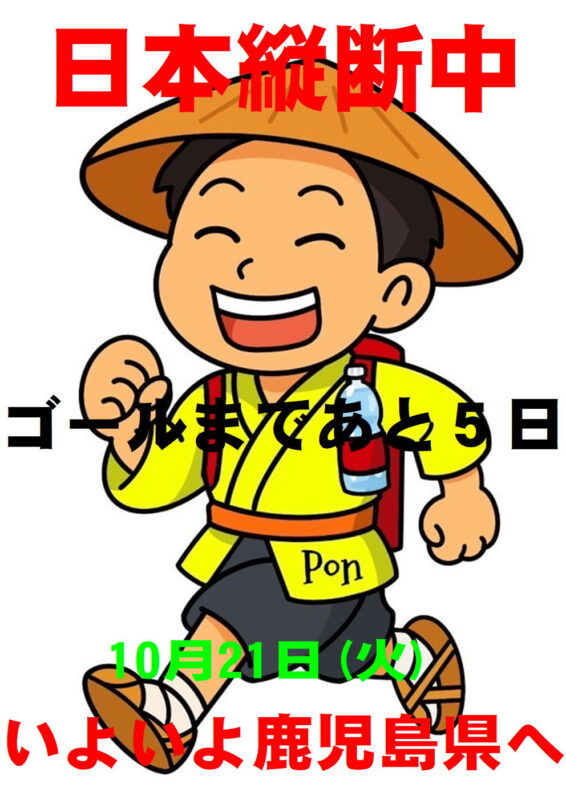 7月11日に北海道函館市五稜郭を出発して100日超。ついに本日鹿児島県に入りました!! そしていよいよ26日(日)8時過ぎ鶴丸城前に到着予定です。 引き続きのご声援よろしくお願いします。
